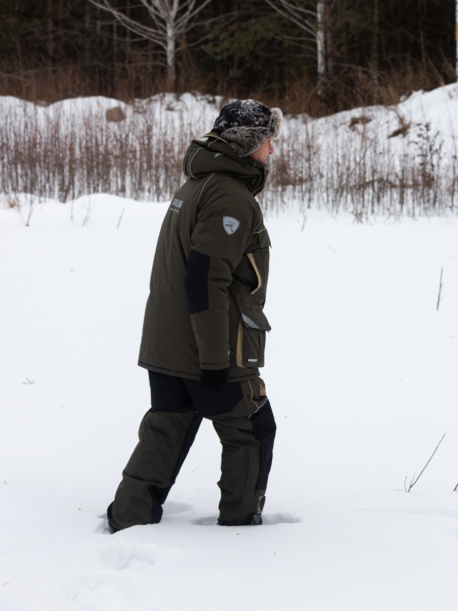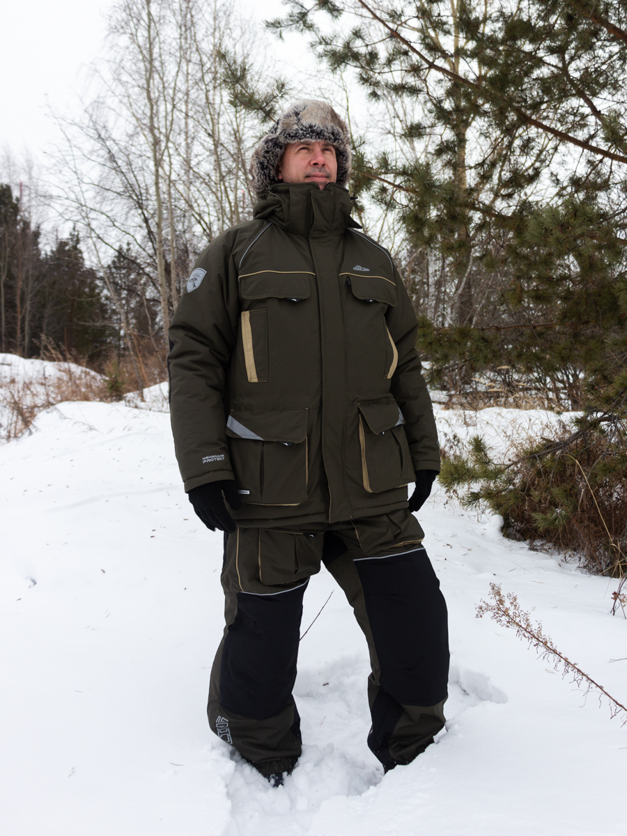 Костюм «Камчатка» для зимней рыбной ловли. Мембранная ткань не продувается и не промокает. Отделка укрепляет износостойкие места (локти, зона сидения, колени).